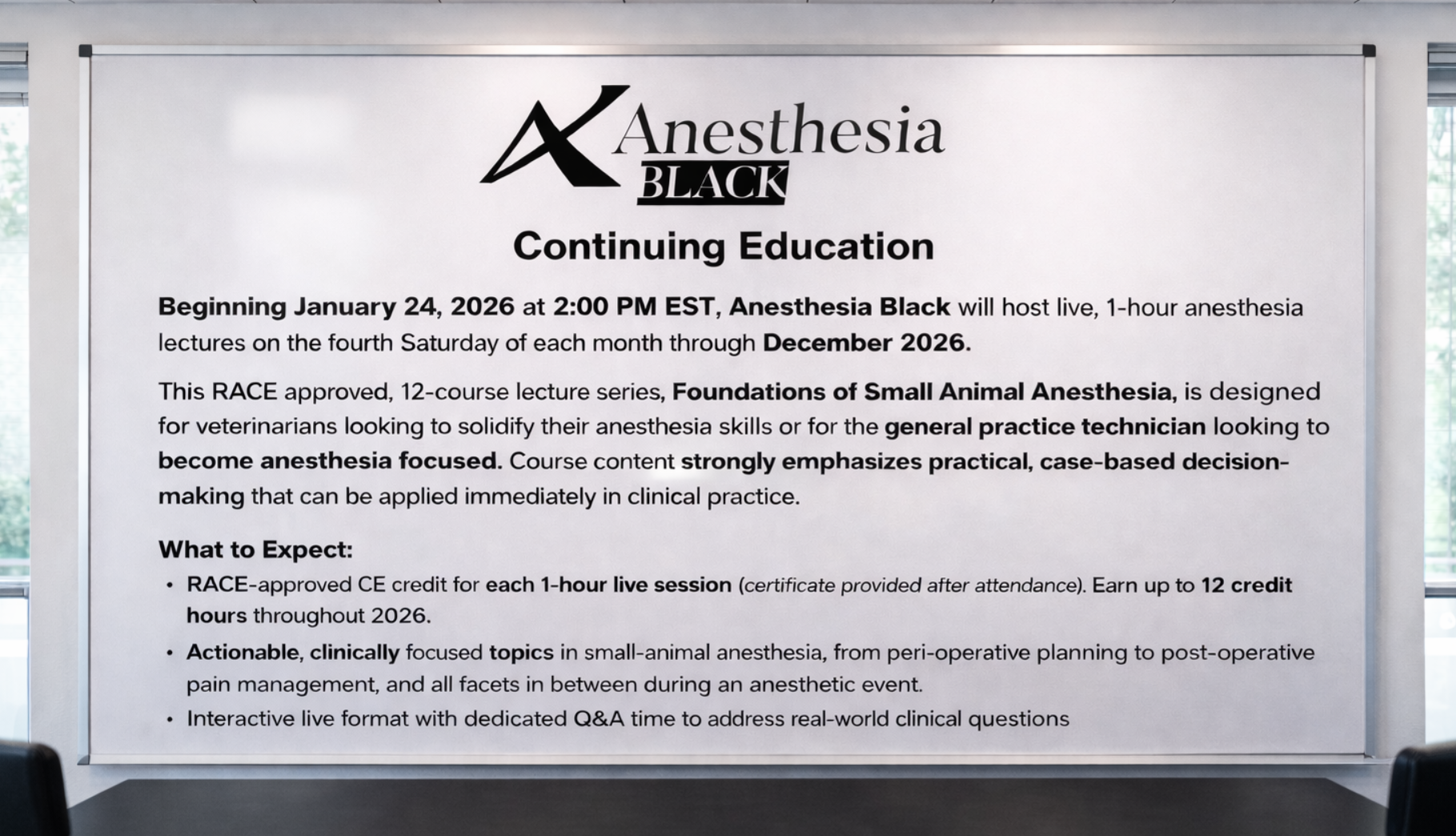 - For a limited time, Anesthesia Black is offering the complete 12-lecture series for $500, providing a discounted option for those who wish to attend the full program.